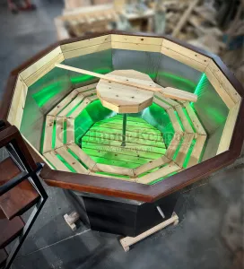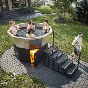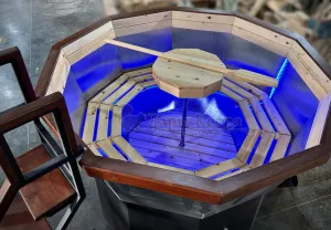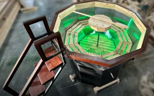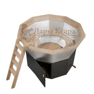 Банный чан с ветрозащитой изготовлен из пищевой стали. Представляет собой большую ёмкость в виде чаши, при нагревании которой можно париться на свежем воздухе. Банный чан установлен на металлическую закрытую подставку, которая служит защитой от ветра и печью одновременно. В комплект такой модели входит дымоход 2 метра. Чан оборудован кедровым бортом, скамейками, подспинниками, трапом для ног и приставной лестницей.