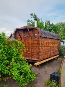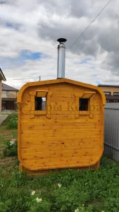 Это прямоугольное изделие с закругленными углами. За счет такой конструкции во время топки воздух циркулирует по кругу, поэтому баня-бочка нагревается не более 30 минут. Баня включает в себя раздевалку и парилку. Лавочки из кедра установлены по всей длине бани-бочки с обеих сторон. Печь расположена в парилке около дальней стены. Для удобства пользования в раздевалке находится вешалка и полочка из кедра. По вашему желанию баню-бочку квадро можно укомплектовать козырьком, верандой и печью с внешней загрузкой, благодаря которой весь мусор после топки остается на улице. Баня-бочка квадро не требует полноценный фундамент, поэтому при необходимости ее можно перенести в другое место.