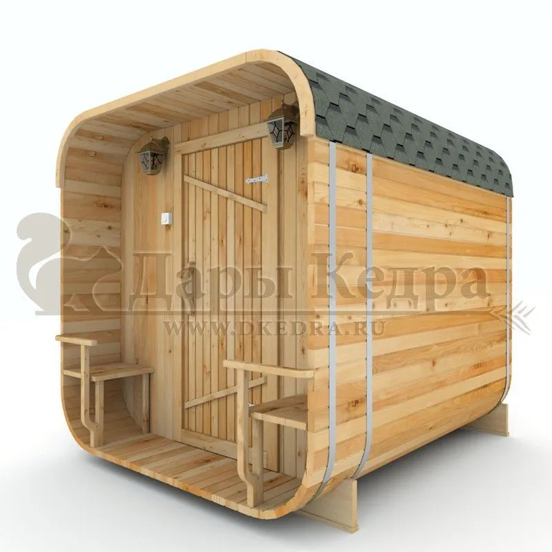 Это прямоугольное с закругленными углами. За счет такой конструкции во время топки воздух циркулирует по кругу, поэтому баня-бочка нагревается не более 30 минут. На веранде можно оставить вещи или отдохнуть после процедур парения. Лавочки из кедра находятся по всей длине бани-бочки с обеих сторон. Печь расположена в парилке около дальней стены. В зависимости от выбранного размера баня-бочка квадро с верандой имеет следующую комплектацию:
