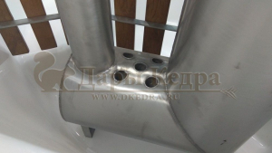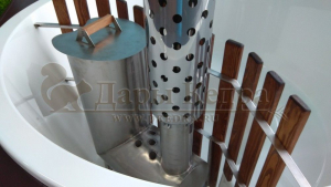 Это уличная подогреваемая купель с круглой внутренней чашей, которая изготовлена из современного прочного и термоустойчивого материала (композита). Форма чаши обеспечивает комфортную посадку во время принятия процедур. Для удобства пользования купель фурако оборудована приставной лестницей. Нагрев воды осуществляется за счет встроенной печи, которая находится внутри купели за перегородкой из кедра. В комплектацию этой модели входит савок с длинной ручкой, который позволяет извлекать угли после эксплуатации изделия. Композитная вставка придает купели красивый внешний вид, продлевает срок службы и облегчает уход за изделием.