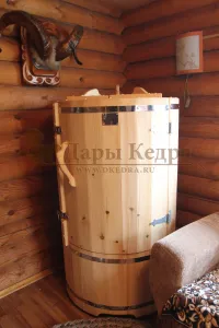 Готовый комплект - это полностью укомплектованный набор с фитобочкой для процедур парения. Круглая модель наиболее компактна и мобильна. Толщина стенок составляет 25 мм. Фитобочка оборудована откидными створками, дверцей и отверстием для головы. Во время парения человек сидит внутри кедровой бочки, а голова находится снаружи. Благодаря этому исключается возможность перегрева. Подлокотники из кедра, встроенные ручки на створках и двери делают эксплуатацию более удобной.