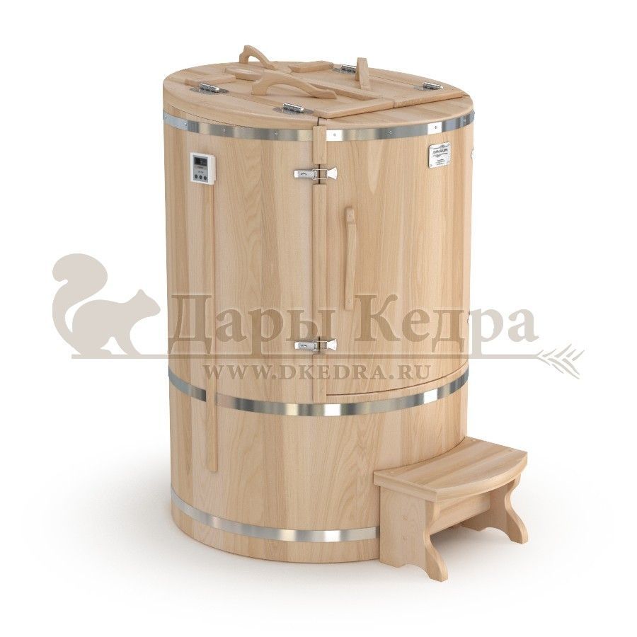 Готовый комплект «Универсальный»: кедровая бочка с парогенератором + био-защита изнутри и снаружи Готовый комплект - это полностью укомплектованный набор с фитобочкой для процедур парения. Овальная модель более просторна и удобна в использовании. Толщина стенок составляет 40-45 мм, что позволяет увеличить срок службы изделия. Верхний скос делает положение головы более комфортным и улучшает обзор. Фитобочка оборудована откидными створками, дверцей и отверстием для головы. Во время парения человек сидит внутри кедровой бочки, а голова находится снаружи. Благодаря этому исключается возможность перегрева. Подлокотники из кедра, встроенные ручки на створках и двери делают эксплуатацию более удобной. Парение в фитобочке благотворно влияет на организм в целом: повышается иммунитет, выводятся шлаки и токсины, улучшается работа органов тела и состояние кожи.