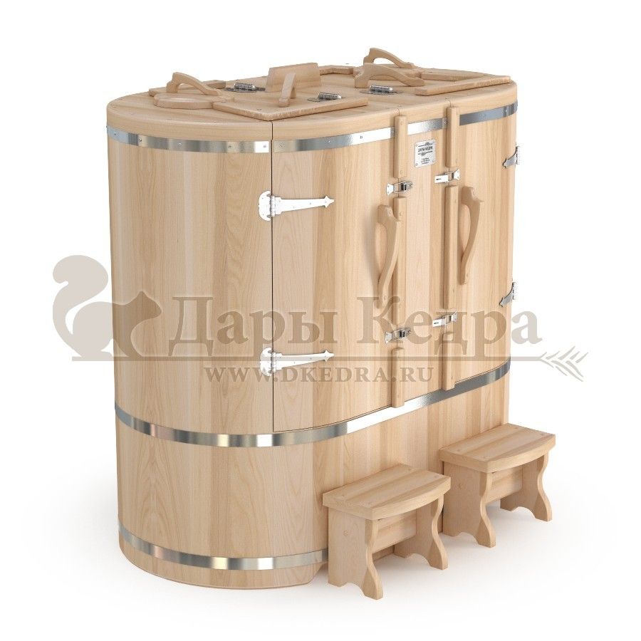 Кедровая бочка (фитобочка) двухместная «Классическая» Двухместная фитобочка из кедра - это парная, в которой удобно принимать процедуры двум людям. Она оборудована откидными створками, дверцей, отверстием для головы и перегородкой (по желанию). Толщина стенок составляет 25 мм. Во время парения человек находится внутри кедровой бочки, а голова снаружи. Благодаря этому исключается возможность перегрева. Подлокотники из кедра и внутренние ручки делают эксплуатацию фитобочки более удобной. Парение в фитобочке благотворно влияет на организм в целом: повышается иммунитет, выводятся шлаки и токсины, улучшается работа органов тела и состояние кожи.