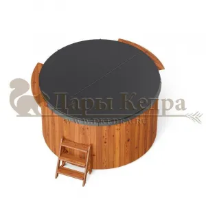 Это купель с круглой внутренней чашей, которая изготовлена из современного прочного и термоустойчивого материала (композита). Форма чаши обеспечивает комфортную посадку внутри изделия. Для удобного использования купель оснащена приставной лестницей. Обручи из нержавеющей стали декорируют купель с композитом и равномерно распределяют нагрузку во время процедур.