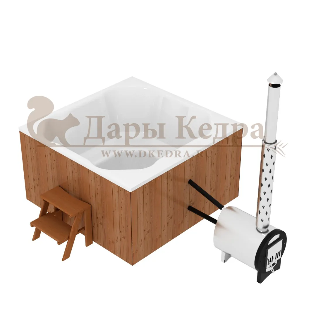 Финская квадратная композитная купель с подогревом (с внешней печкой) «кварта 200 хот 45 квт » Это уличная подогреваемая купель с квадратной внутренней чашей, которая изготовлена из современного прочного и термоустойчивого материала (композита). Форма чаши обеспечивает комфортную посадку во время принятия процедур. Для удобства пользования купель оборудована приставной лестницей. Подогрев воды осуществляется внешней печью с дымоходом. Композитная вставка придает купели красивый внешний вид, продлевает срок службы и облегчает уход за изделием. Парение на свежем воздухе – это отличный способ укрепить здоровье и поддержать организм в тонусе.