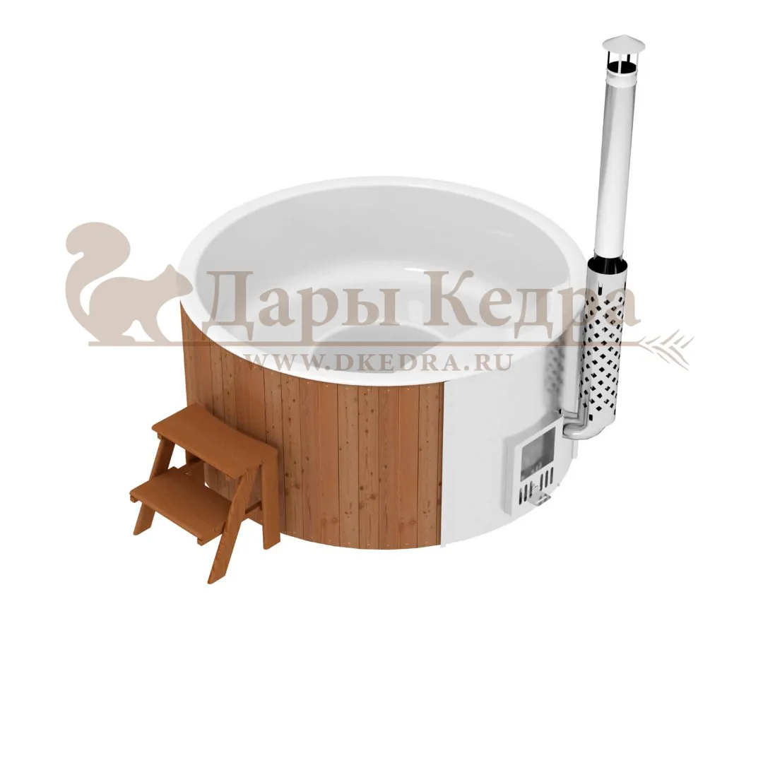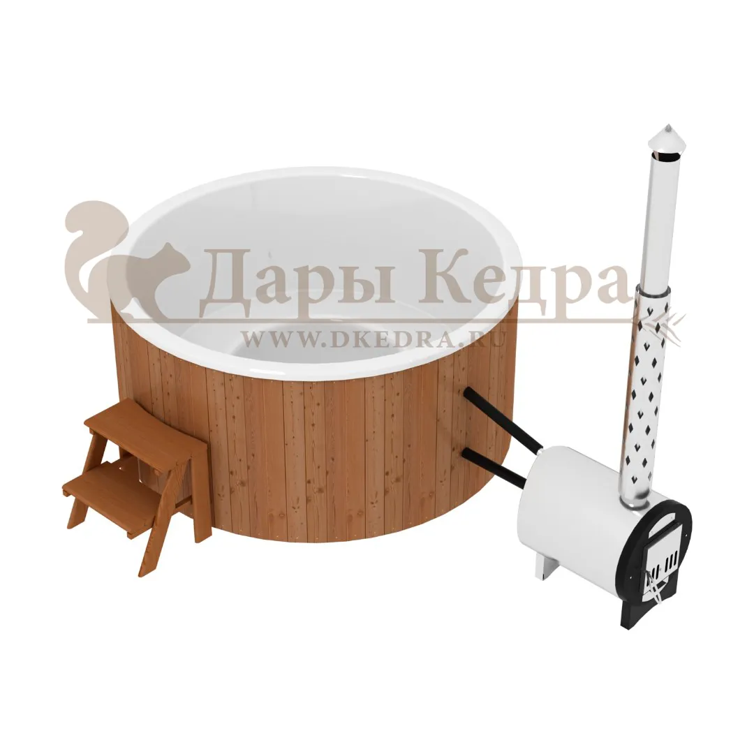 Финская круглая композитная купель с подогревом (с печкой) «Премиум 160 хот с печью 25 квт» Это уличная подогреваемая купель с круглой внутренней чашей, которая изготовлена из современного прочного и термоустойчивого материала (композита). Форма чаши обеспечивает комфортную посадку во время принятия процедур. Для удобства пользования купель оборудована приставной лестницей. Подогрев воды осуществляется внешней печью с дымоходом. Композитная вставка придает купели красивый внешний вид, продлевает срок службы и облегчает уход за изделием. Парение на свежем воздухе – это отличный способ укрепить здоровье и поддержать организм в тонусе.