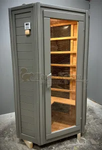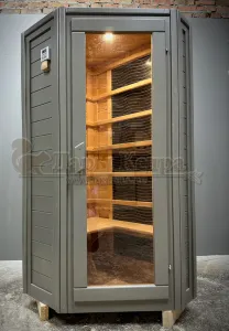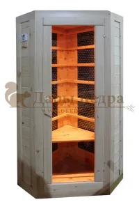 Это специально оборудованная кедровая кабина для прогрева тела человека сухим теплом. Воздух в таких парных не нагревается. Инфракрасные лучи воздействуют на тело, равномерно прогревая мышцы, суставы и органы. Карбоновые излучатели, встроенные в стены кабины, обладают мягким прогревом, что полностью исключает возможность ожога. Работает кабина за счет электричества. Установка сауны в угол, позволяет рационально использовать пространство помещения. Подходит как для домашнего использования, так и для коммерции.