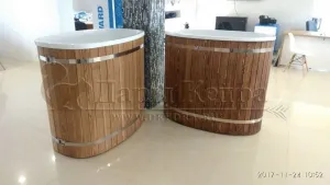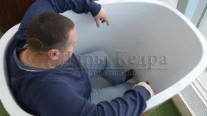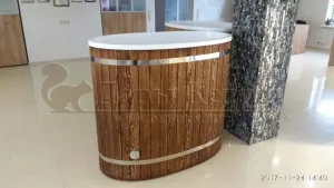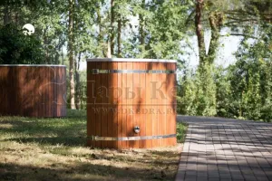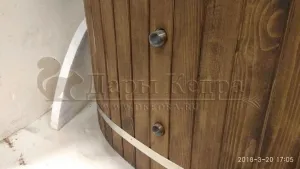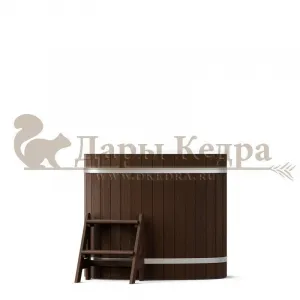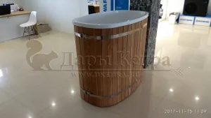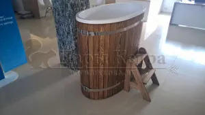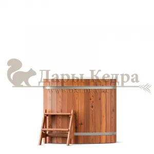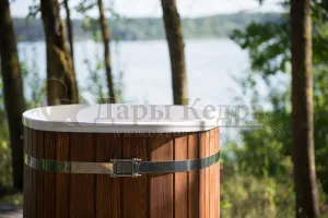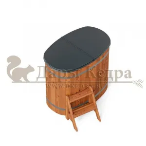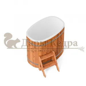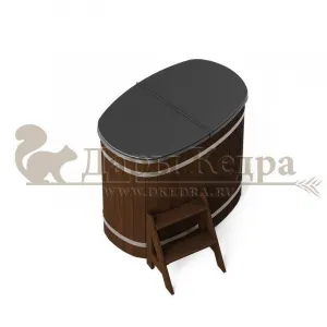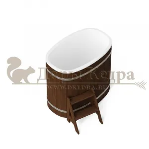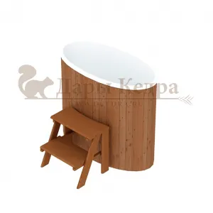 Это купель с внутренней овальной чашей, которая изготовлена из современного прочного и термоустойчивого материала (композита). Форма чаши обеспечивает комфортную посадку внутри изделия. Для удобного использования купель оснащена приставной лестницей. Обручи из нержавеющей стали декорируют купель с композитом и равномерно распределяют нагрузку во время процедур.