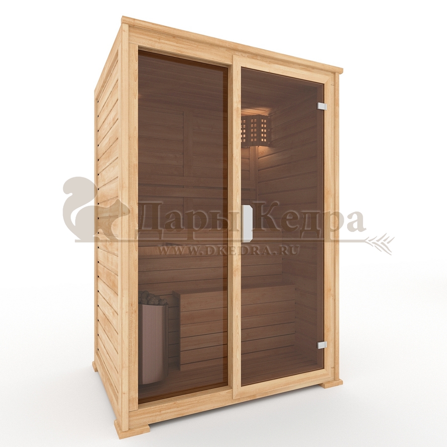 Двухместная финская сауна кабина из кедра и липы с электрокаменкой Это специально оборудованная готовая деревянная кабина для сухого и влажного парения. Электропечь нагревает пространство внутри и позволяет сбрызгивать камни водой, слегка увлажняя воздух. Такая процедура позволяет избежать перегрева. Сауна обшита снаружи и внутри вагонкой из липы и имеет теплоизоляционный слой. Финская сауна с электропечью подойдет, как для домашнего использования, так и для коммерции. Доставляется в разборном виде щитами, собирается по инструкции с помощью шуруповёрта. Обращаем Ваше внимание, что в стоимость сауны уже включена дверь с закаленным стеклом в раме из кедра с фиксатором и деревянным фасадом справа. Вы можете заменить фасад на цельностеклянный с безрамной дверью за дополнительную плату