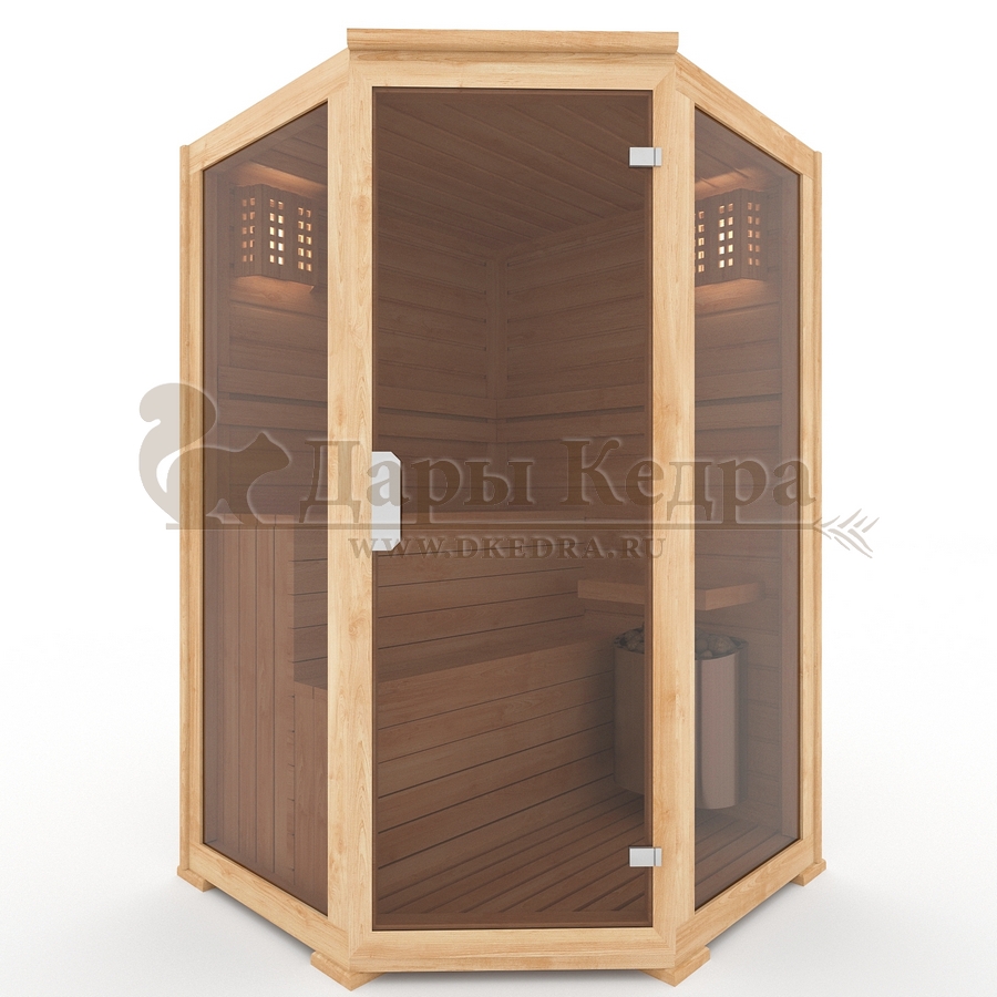 Двухместная угловая финская сауна кабина из кедра и липы с электрокаменкой Это специально оборудованная деревянная кабина для сухого и влажного парения. Электропечь нагревает пространство внутри и позволяет сбрызгивать камни водой, слегка увлажняя воздух. Такая процедура позволяет избежать перегрева. Сауна обшита снаружи и внутри вагонкой из липы и имеет теплоизоляционный слой. Установка сауны в угол позволяет рационально использовать пространство помещения. Финская сауна с электропечью подойдет как для домашнего использования, так и для коммерции. Доставляется в разборном виде щитами, собирается по инструкции с помощью шуруповёрта. Обращаем Ваше внимание, что в стоимость сауны уже включена дверь с закаленным стеклом в раме из кедра с фиксатором и деревянным фасадом справа. Вы можете заменить фасад на цельностеклянный с безрамной дверью за дополнительную плату.
