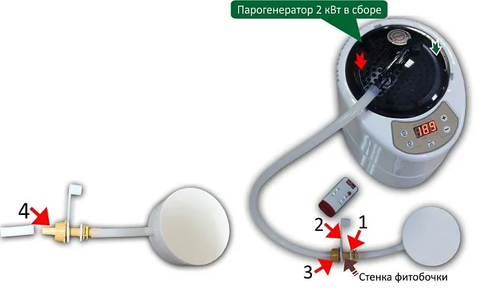 • Второй конец паропровода вставляется снаружи бочки в выведенное отверстие - 4.
