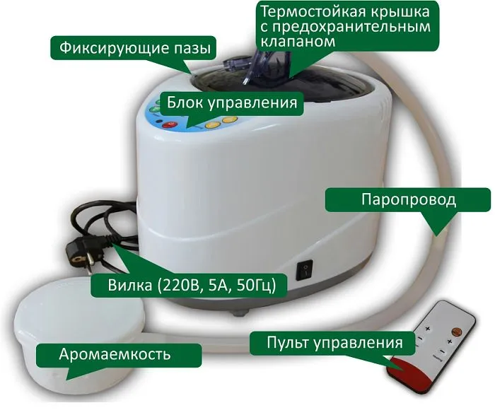 1. Для работы устройства выработки пара помещение должно быть оборудовано розеткой (220В, 5А, 50 Гц).