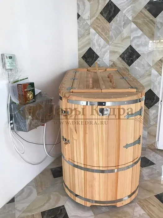 В любой фитобочке парение возможно благодаря парогенератору, который преобразует воду в пар. Пар по паропроводу, расположенному под сиденьем фитобочки, равномерно распределяется внутри мини-парной. За счет округлой формы изделия, фитобочка очень быстро прогревается, пар не задерживается в углах, правильно распределяется внутри всей поверхности. В аромоемкость парогенератора можно положить пакетированные травы. И, таким образом, пар, выходящий в бочку, будет насыщен полезными травами. Правильно подобранные фитосборы помогут расслабиться после тяжелого рабочего дня, а также станут незаменимым помощником в борьбе с многими вирусами. За счет проникновения через кожу фитопаров и фитонцидов кедра, а также теплового воздействия, ускоряется циркуляция крови, учащается сердцебиение. С потом выходят скопившиеся шлаки и токсины.