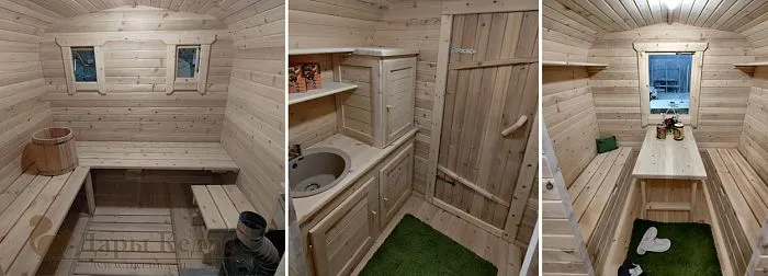 Компания «Дары Кедра» занимается производством мобильных бань и кемпингов уже более шести лет. За это время были освоены новые технологические процессы, позволяющие построить теплый кемпинг, в котором будут проведены все коммуникации, встроена техника, шкафы и даже выделено отдельное помещение для сауны. Казалось бы, зачем целую комнату задействовать под сауну? Но представьте ситуацию, когда вы приходите с прогулки зимой, насколько будет приятно и полезно погреться в кедровой парилке. К тому же сауна в доме не позволит быстро ему остыть, сохраняя тепло внутри, словно термос. После парной можно комфортно разместиться в комнате отдыха за чашкой чая или прилечь отдохнуть, для этого уже есть продуманные скамьи-лежаки с отсеком для хранения пледов, одеял и других спальных принадлежностей.
