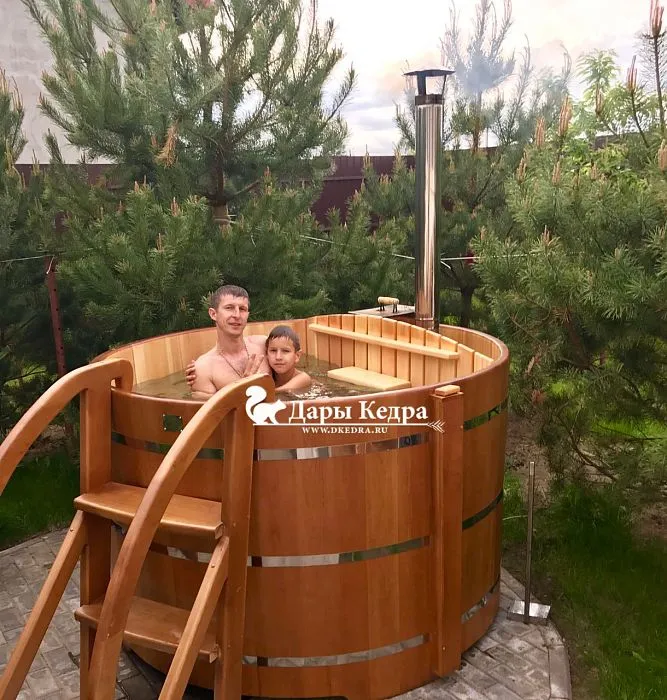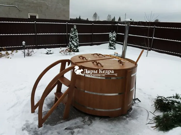 В компании Дары Кедра помимо купелей с внешней или внутренней печью имеются модели с электроподогревом воды, в этом случае электроподогрев служит только для поддержания температуры уже налитой воды в емкость. Рекомендуем использовать специальную крышку, которой накрывают бочку, чтобы сохранить тепло, она может быть деревянной или выполненной из термостойкого материала. Она же защищает баню от попадания мусора и пыли в перерывах между процедурами. Кроме того, Вы можете заказать индивидуальное исполнение. У нас в компании купель с подогревом Фурако изготавливается из древесины кедра или дуба.
