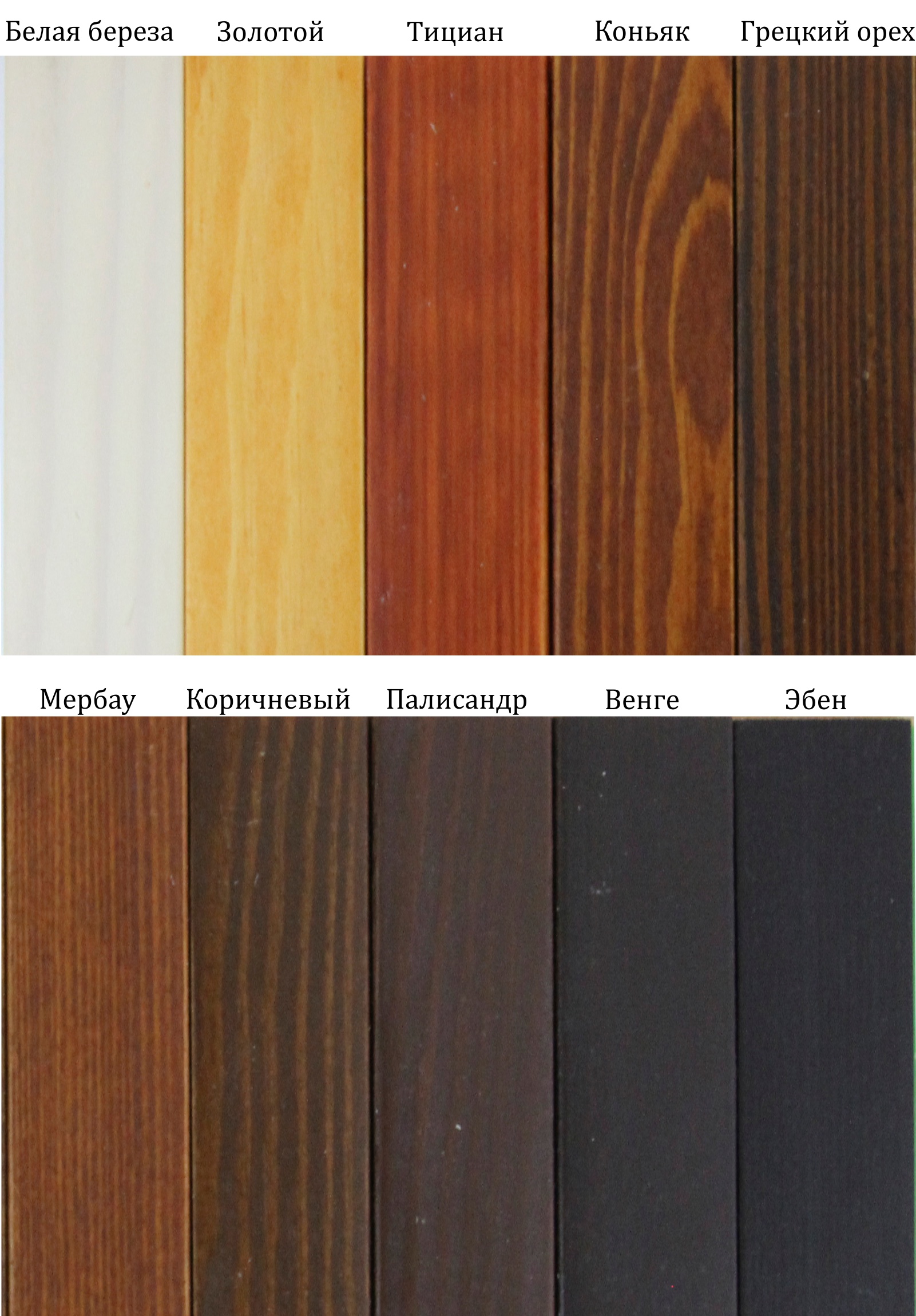 Доступна палитра цветов: "Белая береза", "Золотой", "Тициан", "Коньяк", "Грецкий орех", "Мербау", "Коричневый", "Палисандр", "Венге", "Эбен"