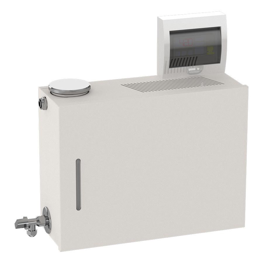 • Парогенератор проточный, 2 кВт с выносным цифровым пультом управления Устройство служит для образования пара путем закипания воды. В металлическом корпусе парогенератора находится бак для воды со съемной аромаемкостью в виде сеточки. Рядом располагается индикатор в виде трубки, благодаря которому осуществляется визуальный контроль за уровнем воды. Проточные парогенераторы подключаются к водопроводу и автоматически добавляют воду в прибор при ее расходовании. Для удобства пользования парогенератор имеет выносной пульт управления, который позволяет установить температуру, мощность и время процедур парения. При достижении необходимой температуры, происходит автоматическое прекращение подачи тепла для нагрева воды. При снижении температуры более чем на 3°С, температурный датчик снова включает подогрев. Таким образом время непрерывной работы парогенератора составляет более 12 часов.