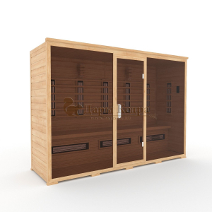Это специально оборудованная кедровая кабина для прогрева тела человека сухим теплом. Воздух в таких парных не нагревается. Инфракрасные лучи воздействуют на тело, равномерно прогревая мышцы, суставы и органы. Керамические излучатели похожи на лампы, имеют высокую температуру нагрева, поэтому защищены противоожоговыми решетками. Тело человека в таких саунах нагревается интенсивнее. Работает кабина за счет электричества. Вместительная пятиместная инфракрасная сауна с керамическими излучателями подойдет для коммерческого использования.